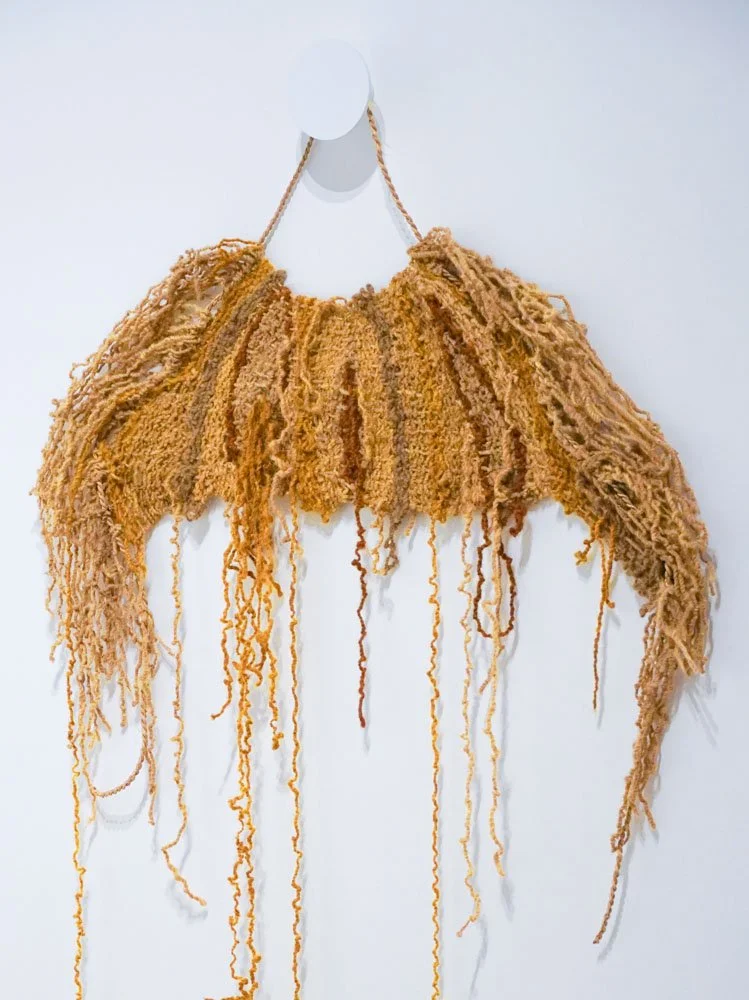 My work starts with research into herbal medicine traditionally used to heal period pain. I naturally dye wool threads with colors extracted from these herbs, each roll of wool becoming a healing remedy, and when mixed, imagined as a way to ease the body’s cyclical pain. I then incorporate my research into a piece I weave using my body as a loom. The work grows on my body like an organ, made of naturally dyed wool with colors extracted from herbs traditionally used in healing period pain.